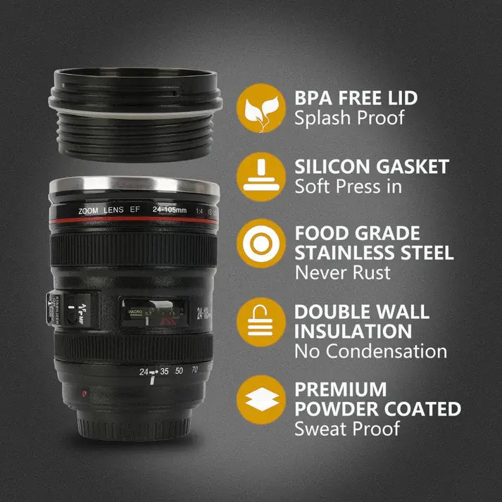 This camera lens stainless steel vacuum thermos mug features a leak-proof lid and double-wall insulation that keeps drinks hot for 4 hours .