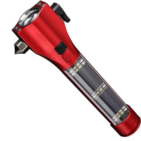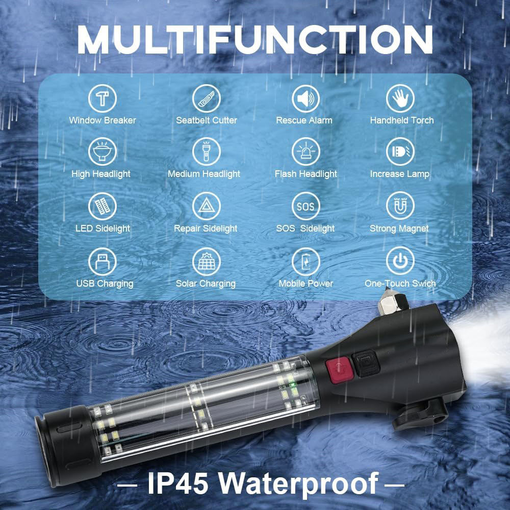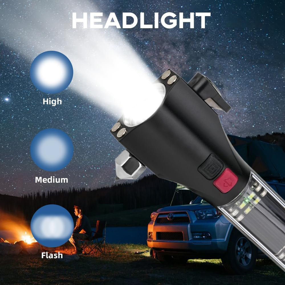 This multi-function car safety hammer flashlight is a powerful 16‑in‑1 emergency rescue tool designed for vehicle safety, outdoor emergencies, and daily preparedness. Combining a high‑lumens LED flashlight, window glass breaker, seatbelt cutter, rescue alarm, and rechargeable power bank, it helps you respond quickly in accidents or dark environments. With solar and USB charging options plus a strong magnetic design, it’s an essential escape kit for every vehicle.