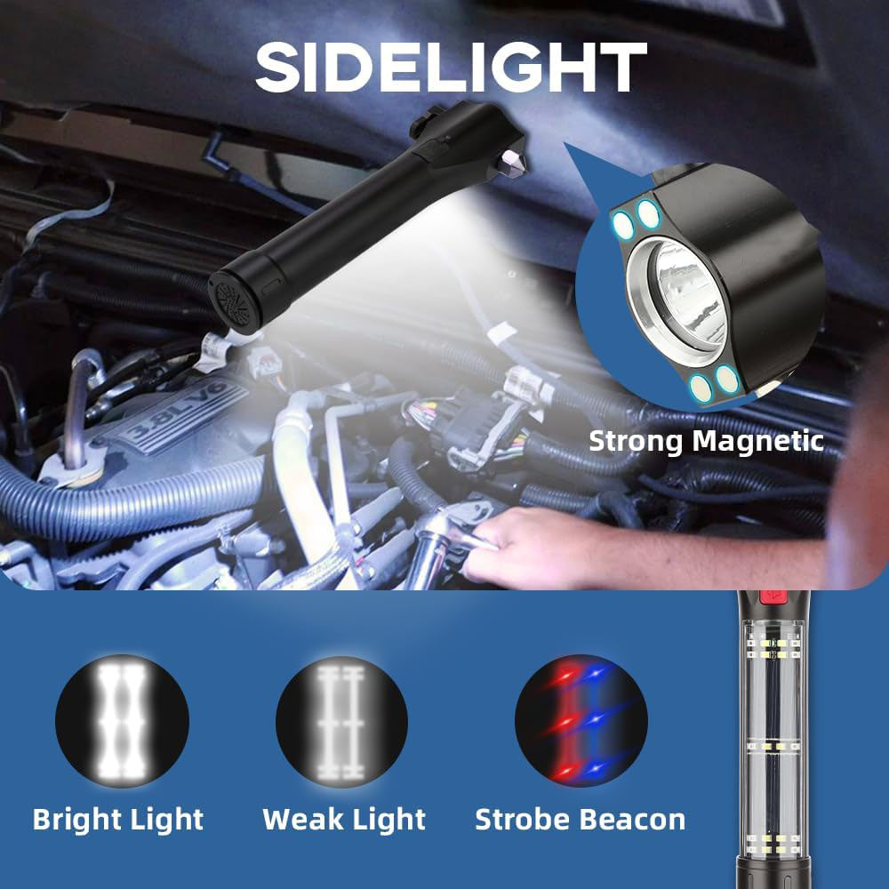 Built‑in strong magnets allow hands‑free use—attach to car surfaces or metal objects as a warning light or repair light. Also functions as a tactical flashlight for lighting and self‑defense.