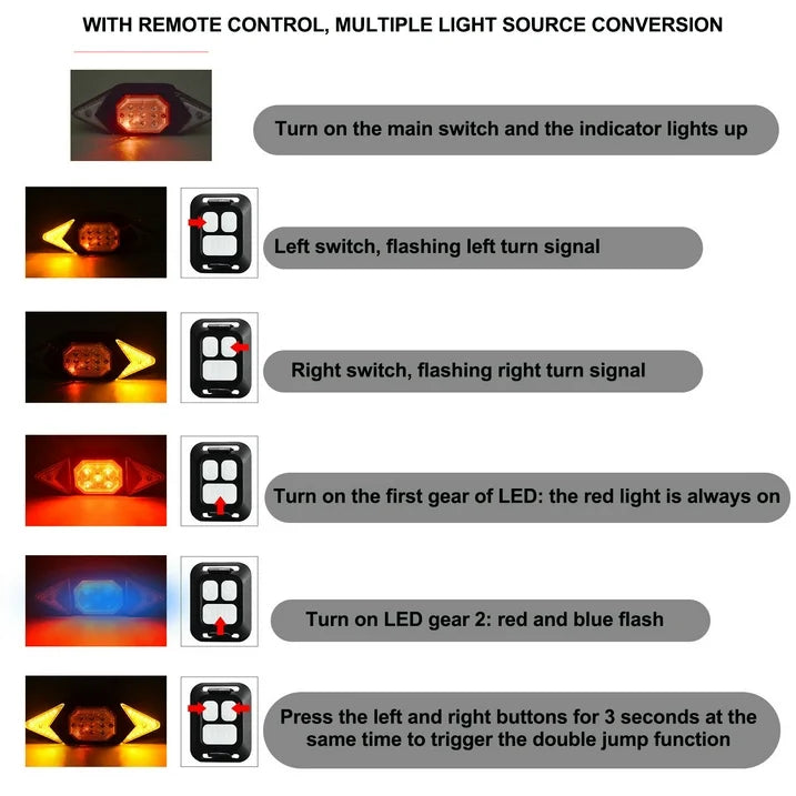 The remote control is compatible with multiple tail lights, allowing you to easily set the turn signal. Simply press and hold the tail light to make it flash, then use the remote to press any button corresponding to the direction of the tail light.
