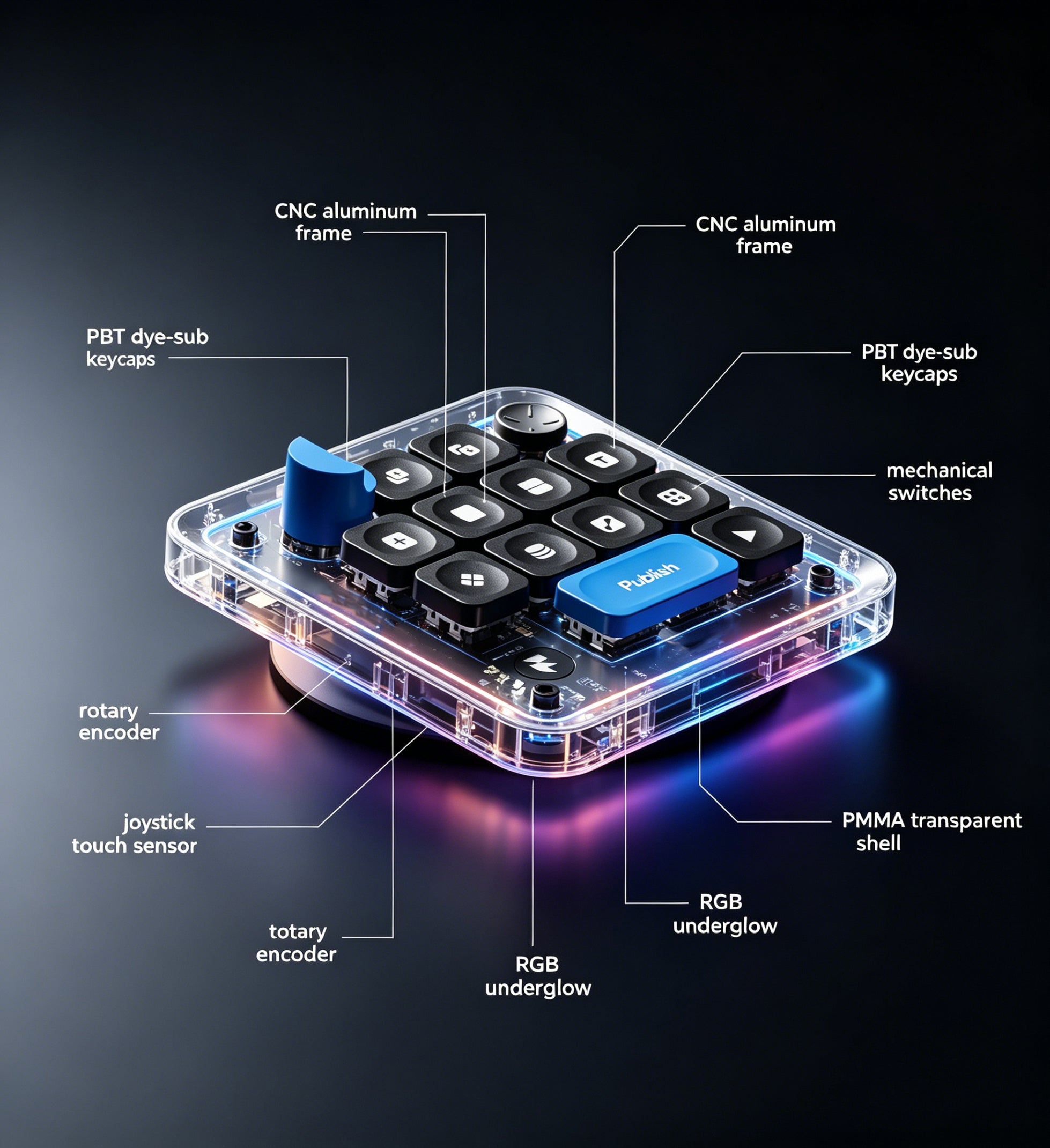 Features mechanical switches, rotary encoder, and joystick for versatile and intuitive control.