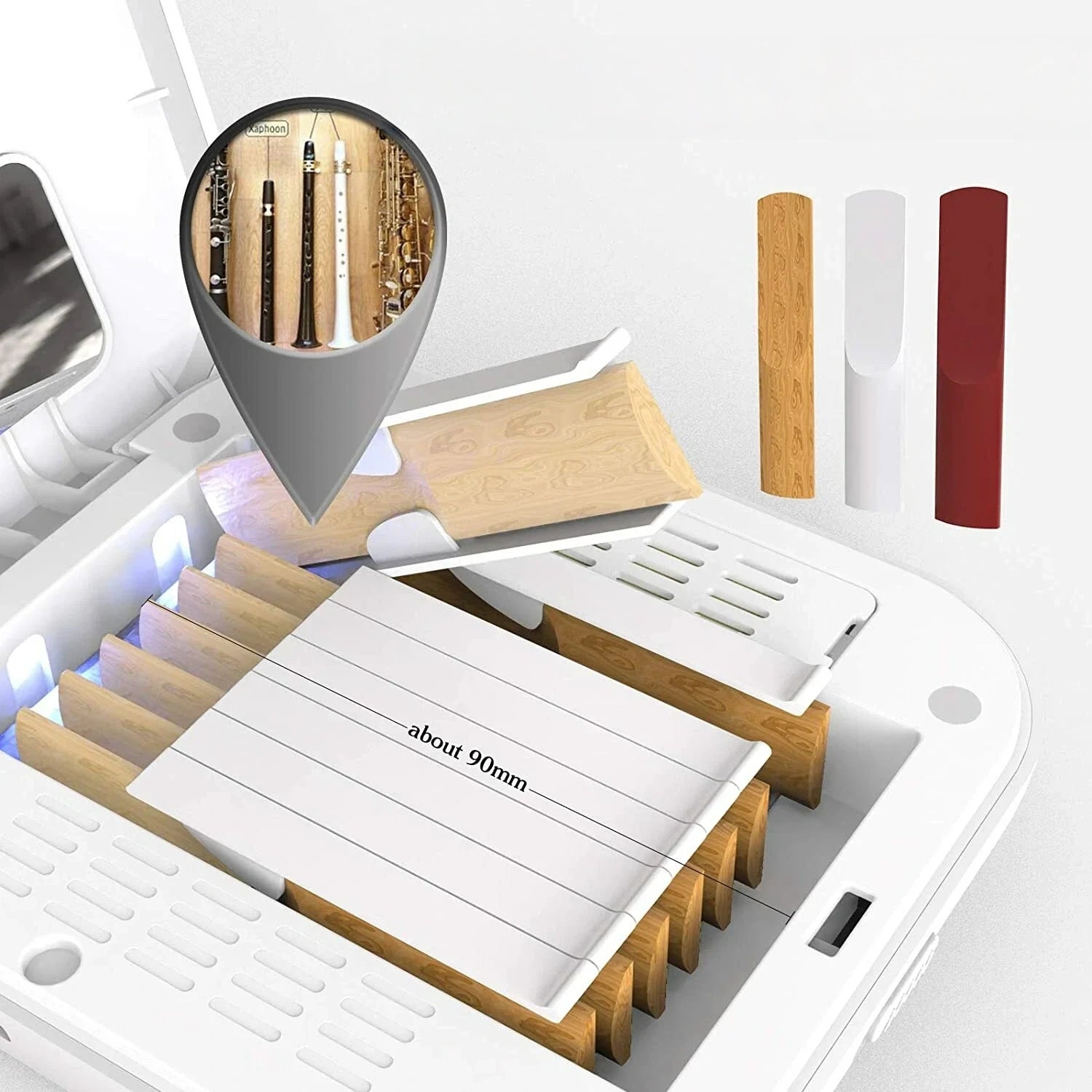 Dual UV lamps (200–400 wavelength range) help keep the reed surface clean between practices. A reflective inner chamber improves coverage, while the fully enclosed lid prevents light leakage for safe daily use.