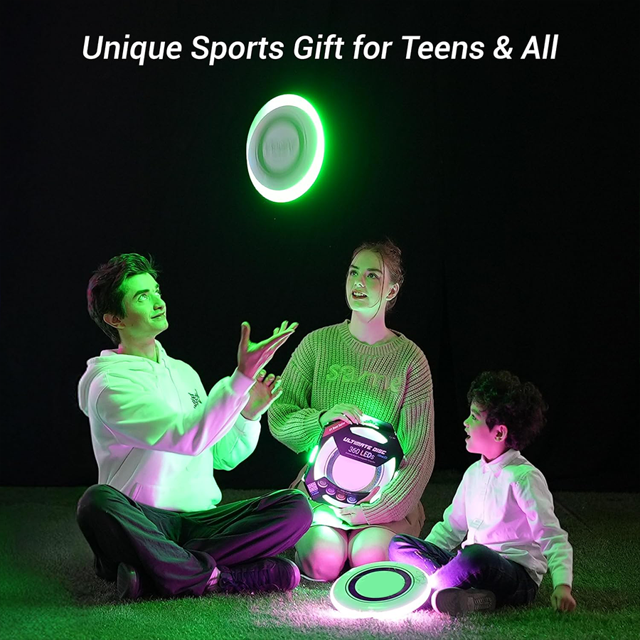 Flying disc designed with LED lighting for bright and fun outdoor play day or night.